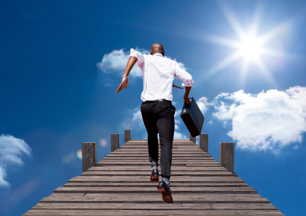 Digital composition of businessman running with briefcase on boardwalk against sky in background